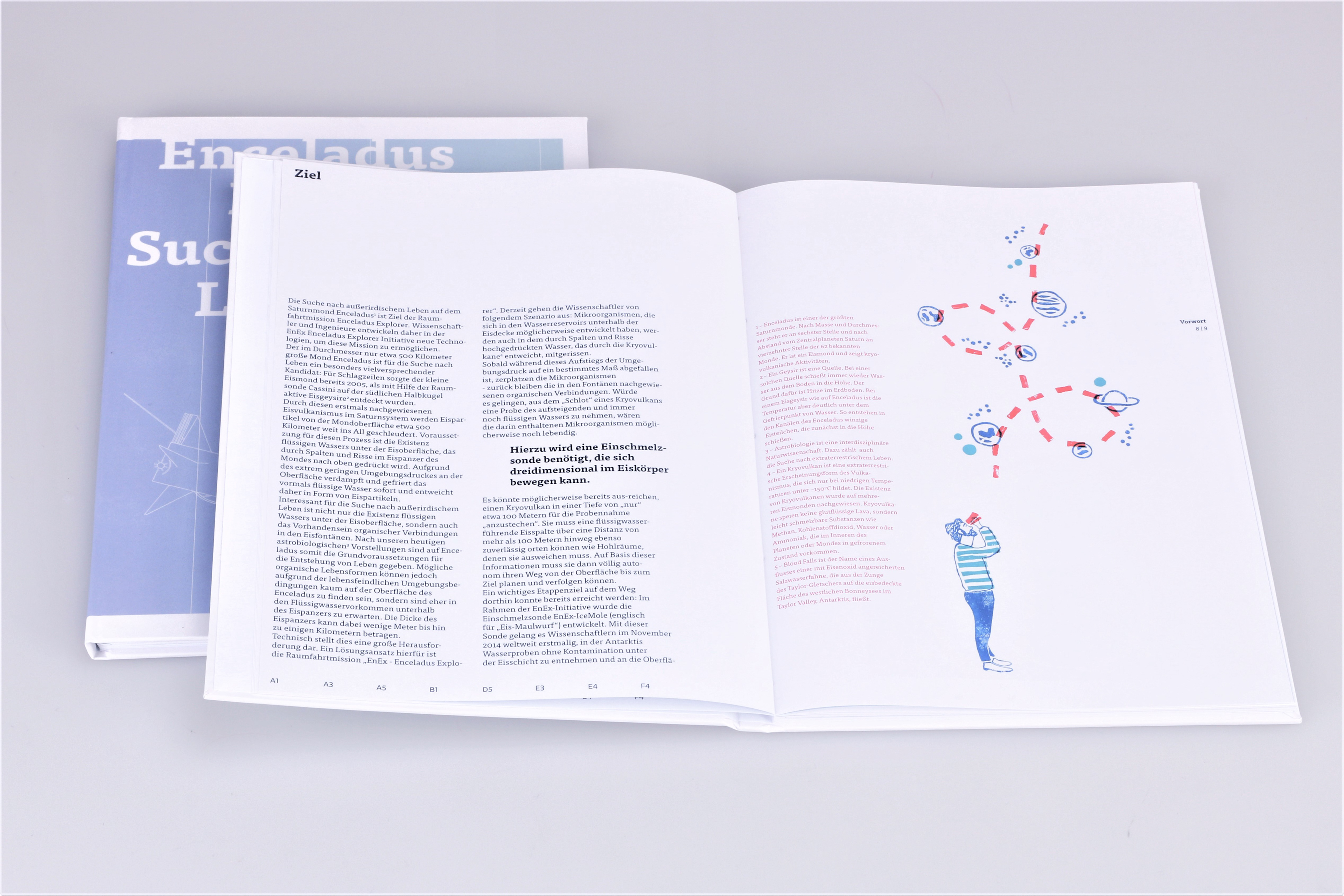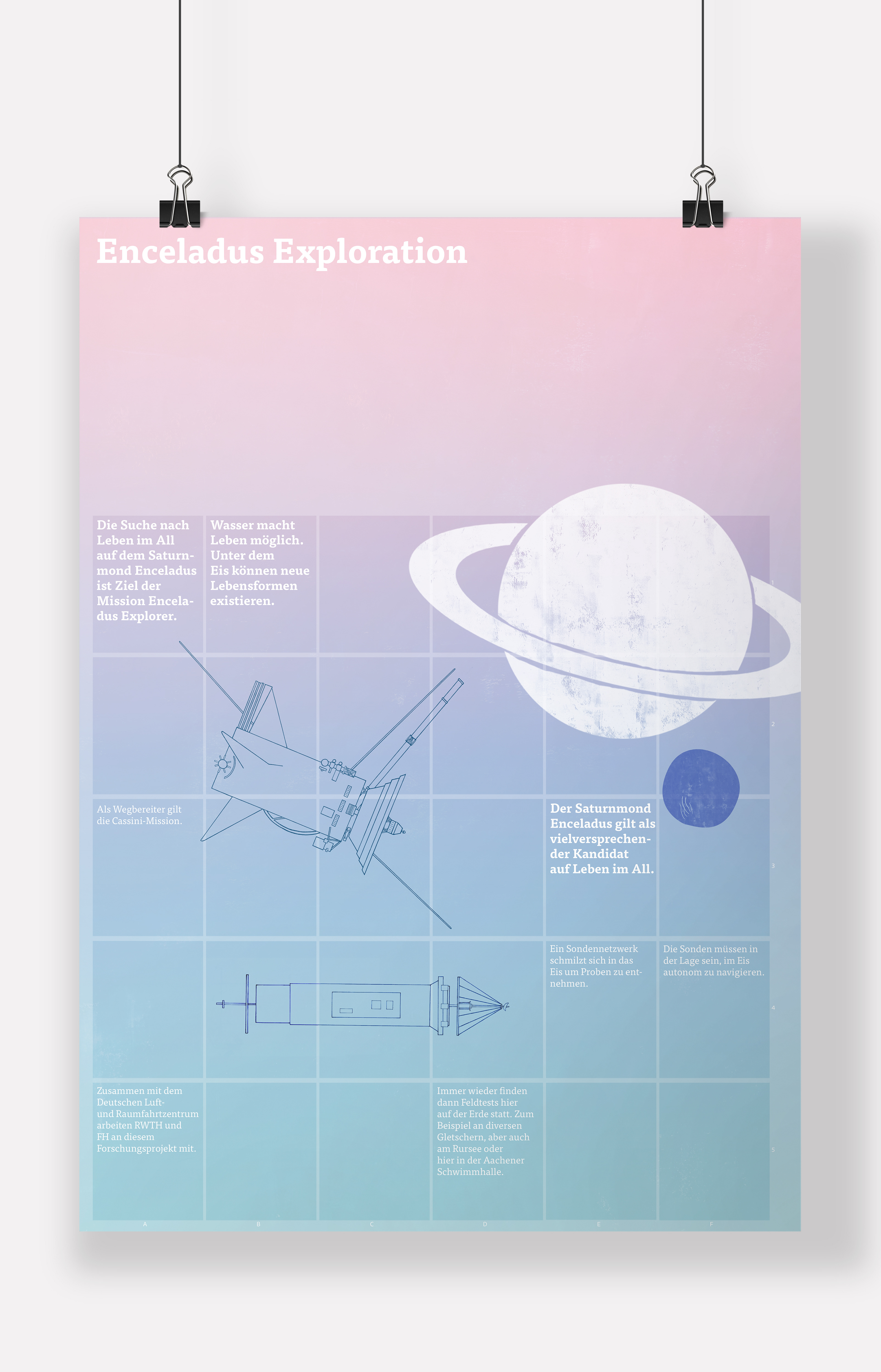 Enceladus Exploration – Suche nach Leben im All _ Die Exploration des Enceladus Mondes im Rahmen der EnEx-Initiative ist das Thema dieser wissenschaftlichen Publikation. Ziel dieser Mission ist die Suche nach extraterrestrischem Leben mit Hilfe von einem Netzwerk aus autonom navi-gierenden Schmelzsonden. Als Grundlage dienen die Arbeiten des EnEx-Range Projektes der RWTH Aachen. Dieses Projekt entstand in Zusammenarbeit mit Hannah Franken und Julia Pawlik (Illustratorin).