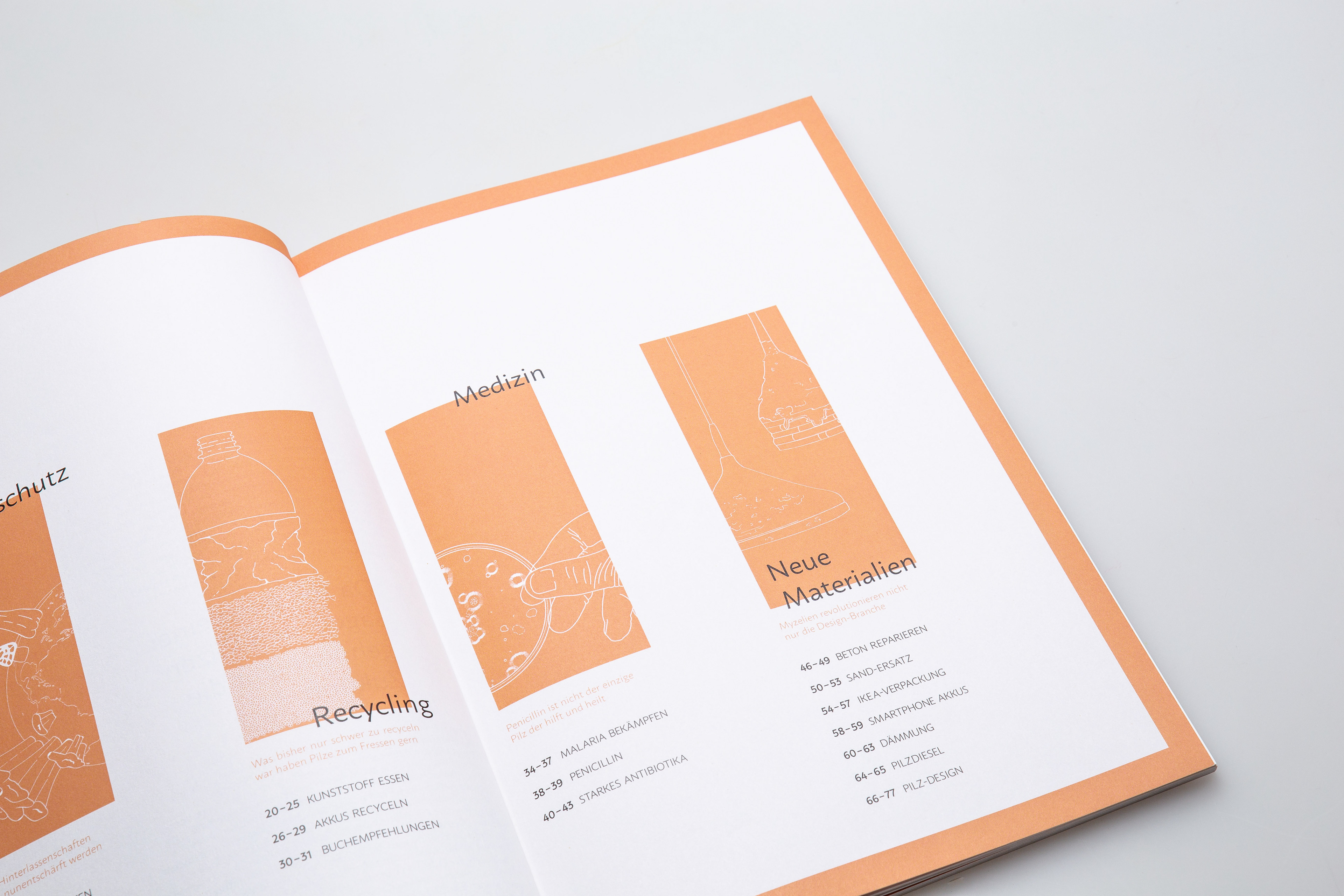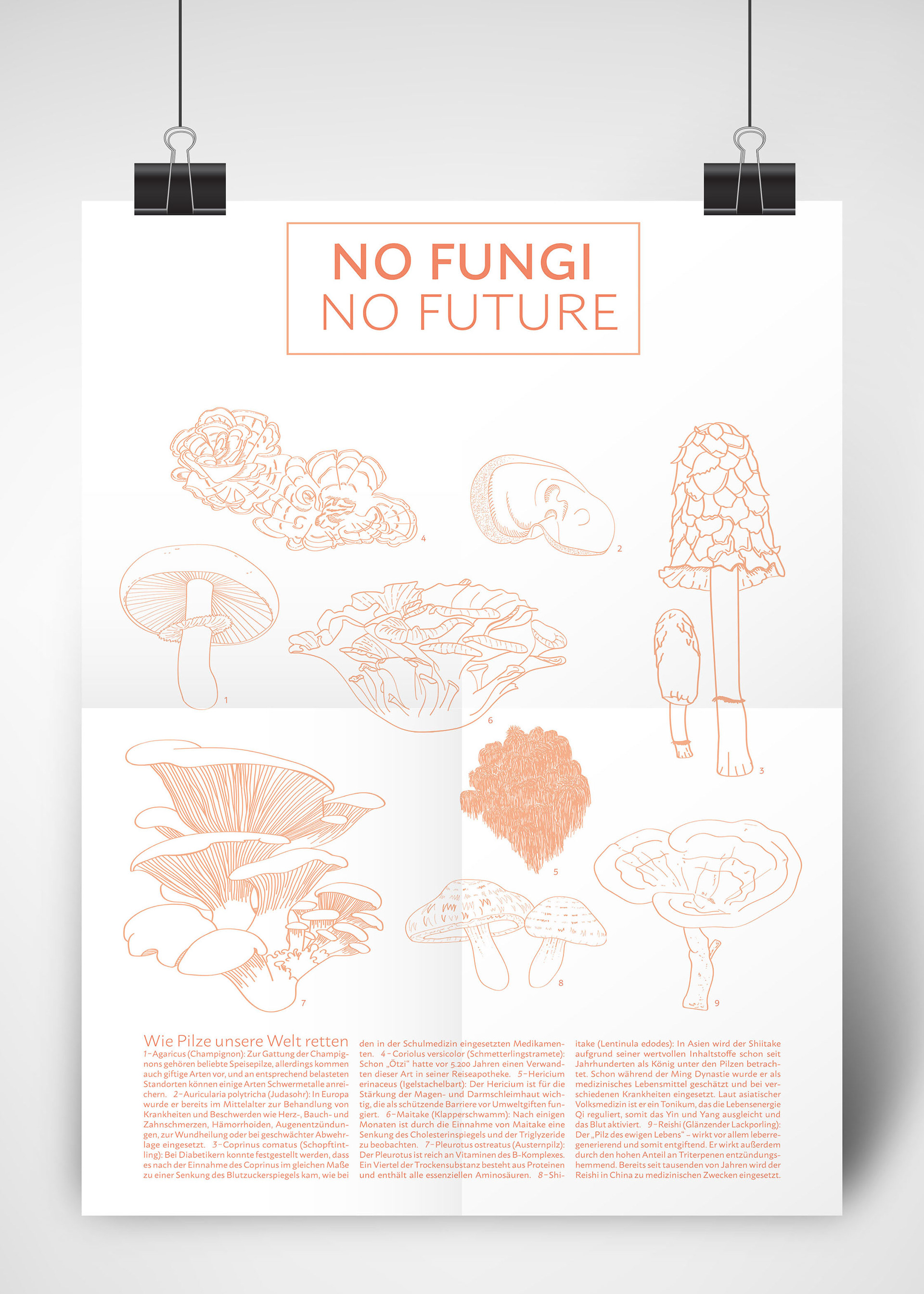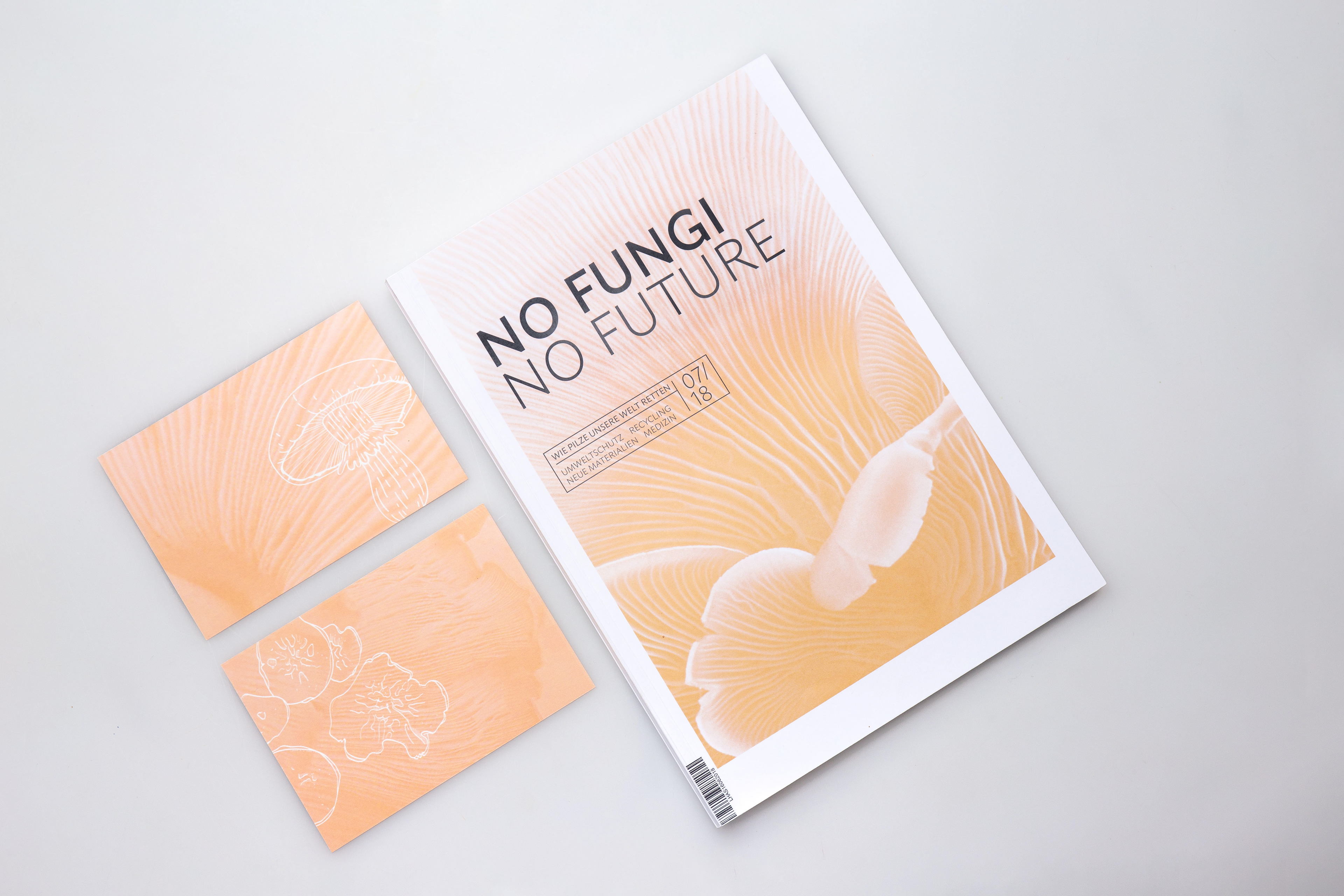 NO FUNGI NO FUTURE _ NO FUNGI NO FUTURE ist ein Magazin, welches sich mit positiven Lösungsansätzen zum Klimaschutz bzw. zur Umweltverschmutzung befasst. Ziel war es, ein Aufklärungsmagazin zu gestalten, dass die Vielfältigkeit eines kleinen Lebewesens repräsentiert. Dieses Magazin richtet sich an wissenschaftlich Interessierte, aber auch an Neugierige, die etwas Neues über unsere wunderbare Welt erfahren möchten. Fachliche Begriffe werden durch kurze Infotexte erklärt. Bilder von mikroskopischen Zellen oder ästhetischen Makroaufnahmen sollen den Pilz von all seinen Facetten zeigen. Fotografien von Pilz-Möbeln oder Pilz-Kleidung sollen den Lesern ein positives Denken über die vielseitige Welt der Pilze vermitteln. Neben dem Magazin sind 2 Postkartenmotive und ein Faltplakat entstanden. Dieses Projekt entstand in Zusammenarbeit mit Larissa Hotze.