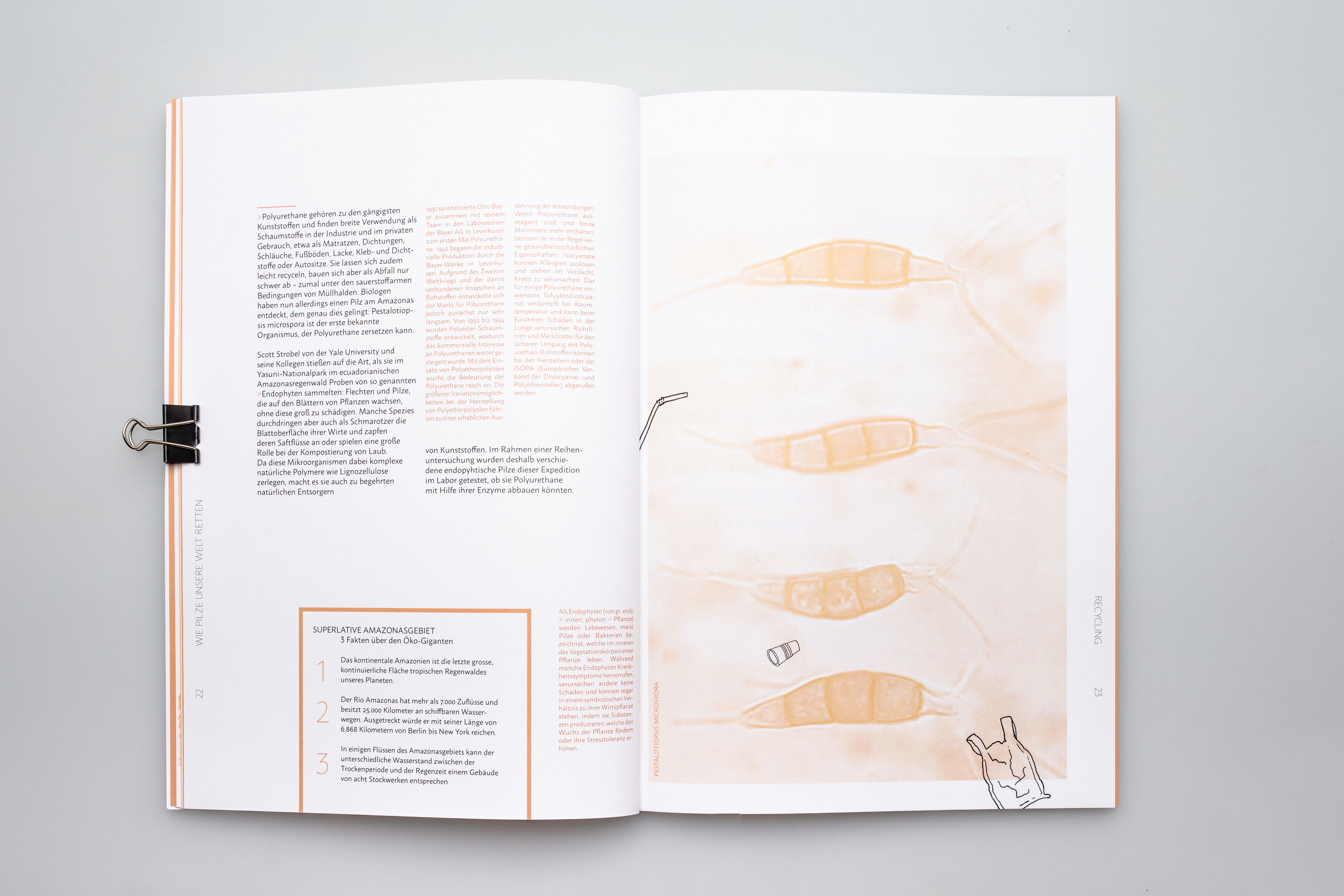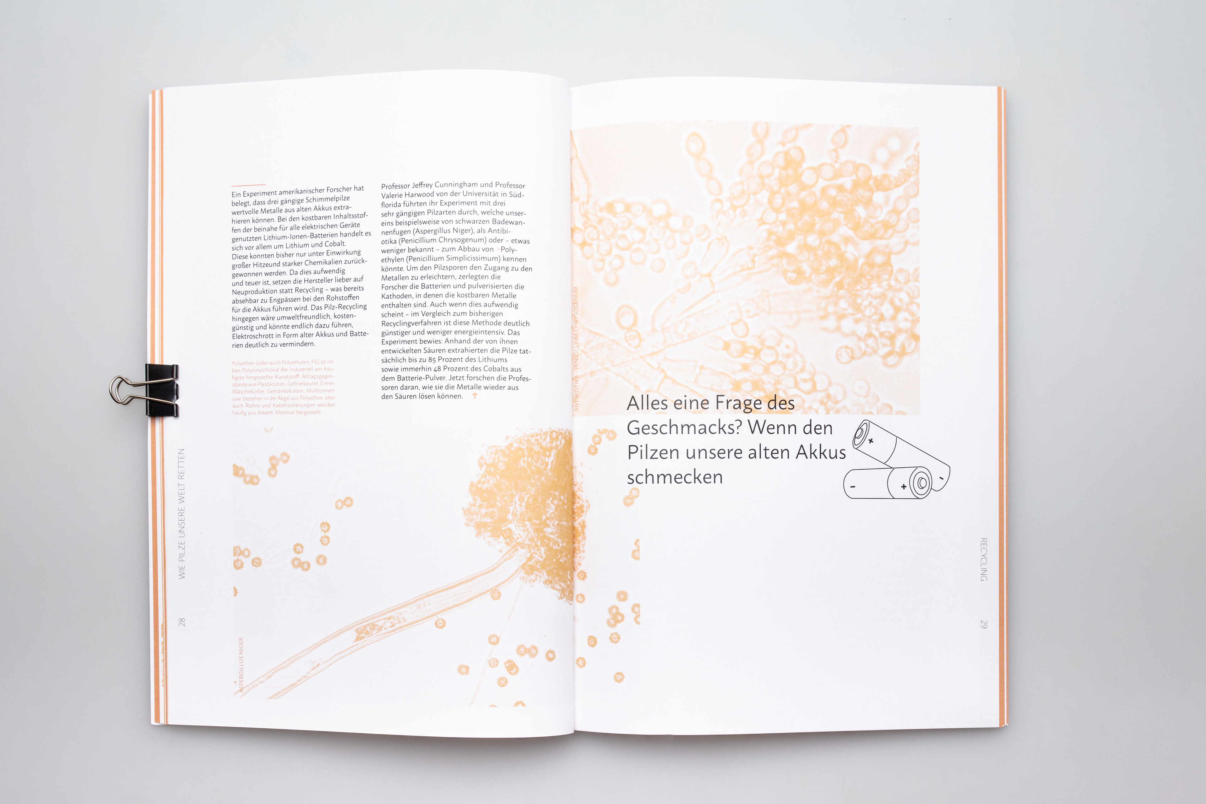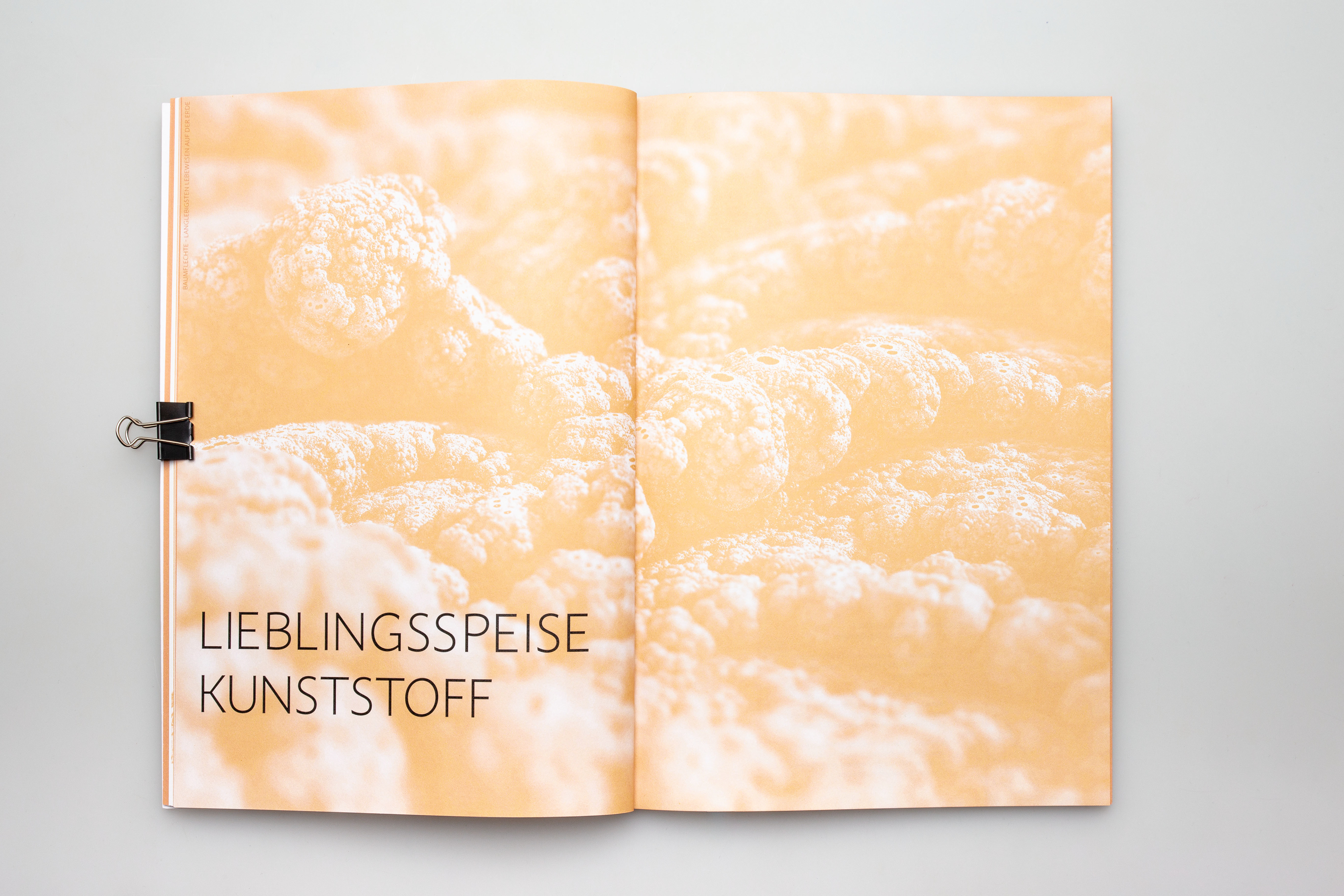 NO FUNGI NO FUTURE _ NO FUNGI NO FUTURE ist ein Magazin, welches sich mit positiven Lösungsansätzen zum Klimaschutz bzw. zur Umweltverschmutzung befasst. Ziel war es, ein Aufklärungsmagazin zu gestalten, dass die Vielfältigkeit eines kleinen Lebewesens repräsentiert. Dieses Magazin richtet sich an wissenschaftlich Interessierte, aber auch an Neugierige, die etwas Neues über unsere wunderbare Welt erfahren möchten. Fachliche Begriffe werden durch kurze Infotexte erklärt. Bilder von mikroskopischen Zellen oder ästhetischen Makroaufnahmen sollen den Pilz von all seinen Facetten zeigen. Fotografien von Pilz-Möbeln oder Pilz-Kleidung sollen den Lesern ein positives Denken über die vielseitige Welt der Pilze vermitteln. Neben dem Magazin sind 2 Postkartenmotive und ein Faltplakat entstanden. Dieses Projekt entstand in Zusammenarbeit mit Larissa Hotze.