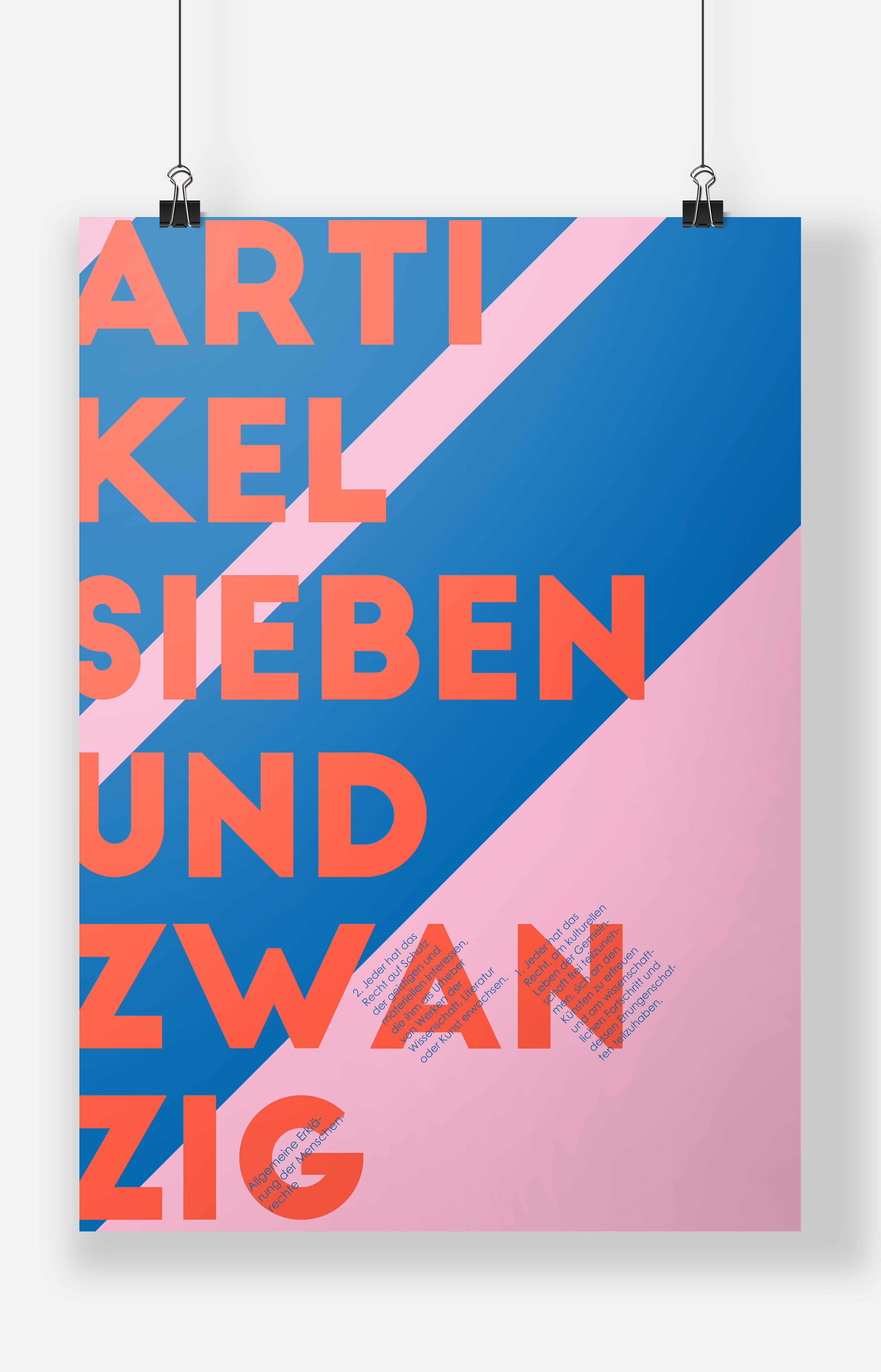 Artikel siebenundzwanzig _ Plakatdesign zum Artikel 27 "Freiheit des Kulturlebens" aus der Allgemeinen Erklärung der Menschenrechte. Die Dekleration beinhaltet unverbindliche Empfehlungen der Vereinten Nationen zu den allgemeinen Grundsätzen der Menschenrechte. Sie wurde am 10. Dezember 1948 in Paris verkündet. Artikel 27: Jeder hat das Recht, am kulturellen Leben der Gemeinschaft frei teilzunehmen, sich an den Künsten zu erfreuen und am wissenschaftlichen Fortschritt und dessen Errungenschaften teilzuhaben. Jeder hat das Recht auf Schutz der geistigen und materiellen Interessen, die ihm als Urheber von Werken der Wissenschaft, Literatur oder Kunst erwachsen.