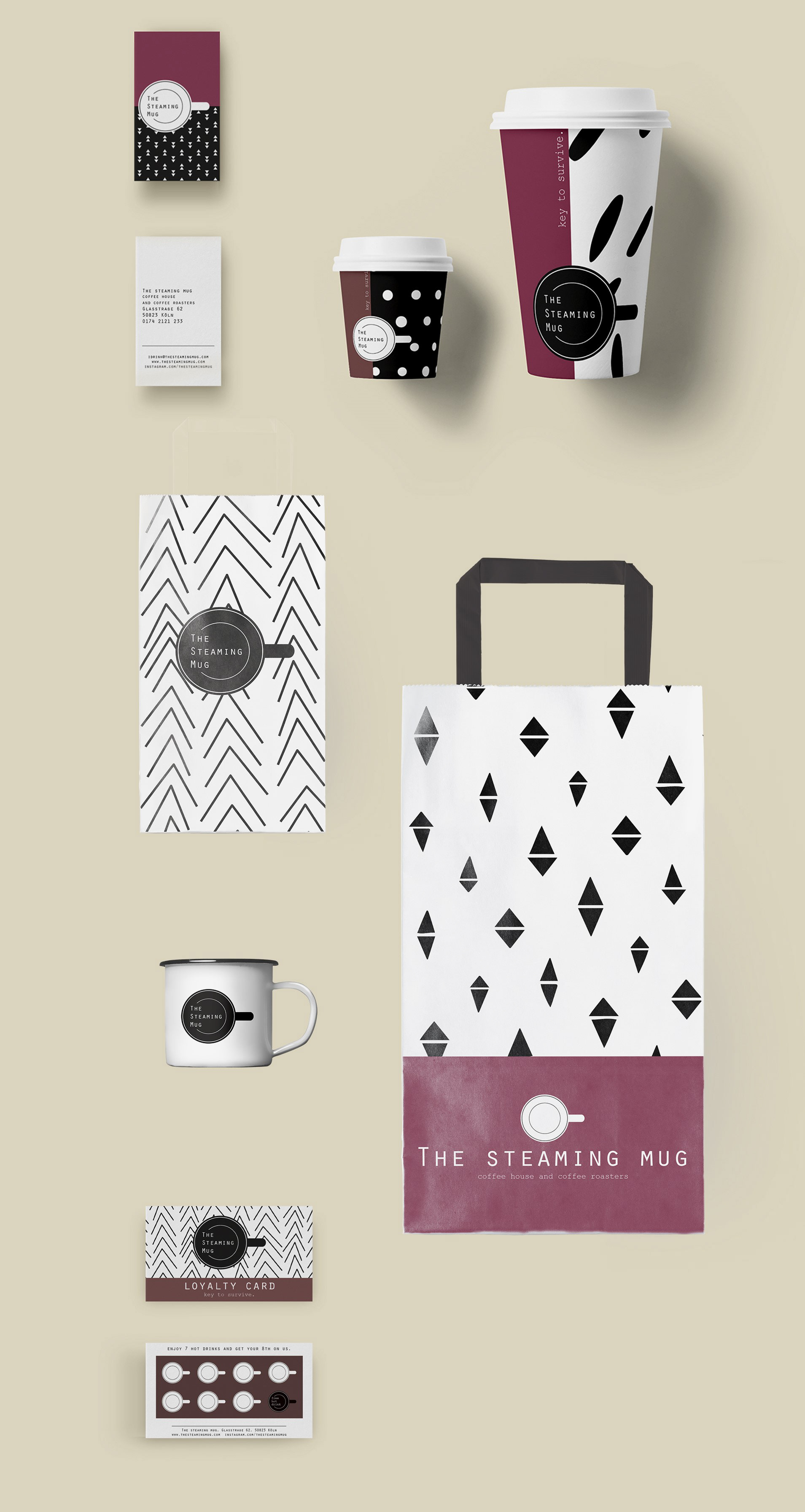 The steaming mug _ Corporate Design eines ausgedachten Cafés im Kölner Veedel Ehrenfeld von Namensgebung bis Packaging. Das Image baut auf den Werten fair, handgemacht und vielfältig auf.